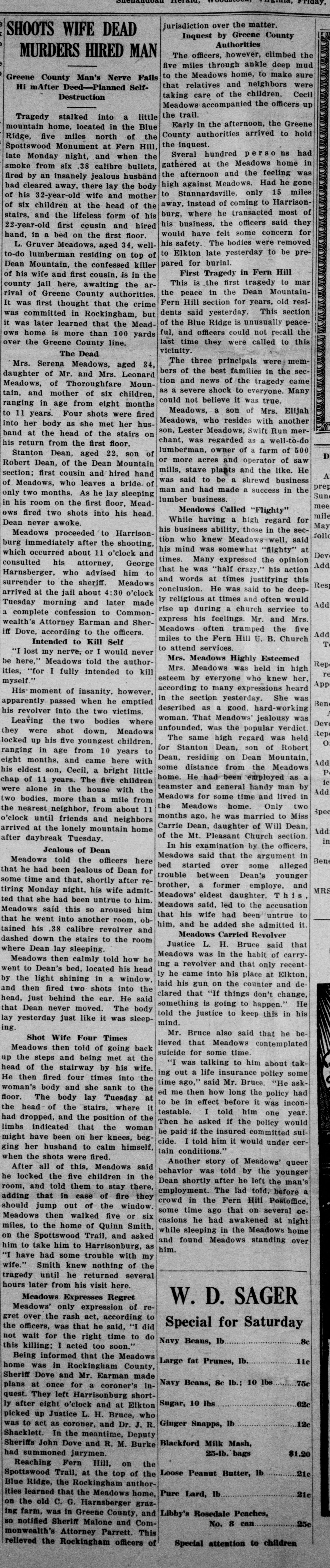 L. Gruver Meadows, aged 34, well-to-do lumberman residing on top of Dean Mountain, the confessed killer of his wife and first cousin, is in the county jail here, awaiting the arrival of Greene County authorities. It was first thought that the crime was committed in Rockingham, but it was later learned that the Meadows home is more than 100 yards over the Greene County line.